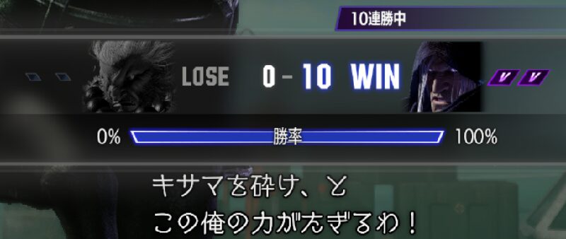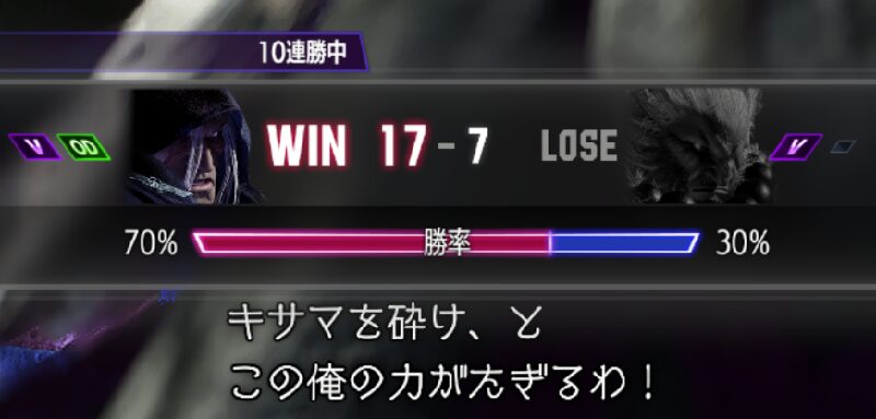 まねもんくん。 7連勝から負けて、そのご8連勝から負け。キレそう。※10連勝したらクリアというルールで活動しております とにかく下段だ。人のこといえないけどワンヒットで端に連れて行かれるから、とにかく被弾しないぞくらいの…