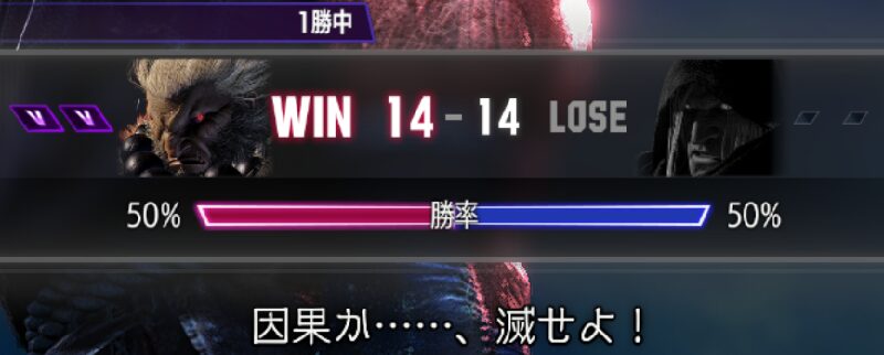 スコアだけ見るとうまく行ってるふうなんだけど、たぶんこれはまねもんくんの動作がおとなしすぎることが原因の大半を占めてるように思う。まねもんくんの戦法が散発的な弾と強Kからの当たればラッキーコンボ、およびダウン後のOD昇竜…