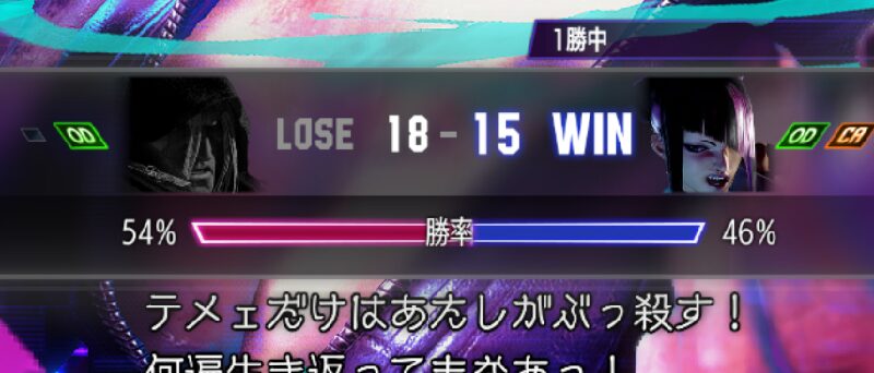 あまり注意を払ってこなかったポイントだが、負け筋になってる行動がある。再現性の高い対戦を繰り返すことで「まあいいか」で看過できなくなってきた。何度も見るとやっぱり記憶に残るよね。ジュリのラッシュを警戒して弱P振ってたら強…