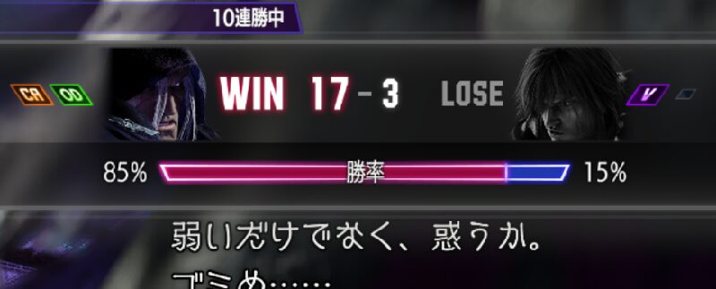 たった4日前に勝った相手なんだけど、不安になったわけです。ジュリとか触り始めて、もう忘れたんじゃないか。あんときたまたま勝てただけなんじゃないか。みたいな色々が。10連勝したら勝ちだと自分で定めているにもかかわらず、そう…