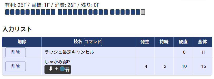 とりあえずそれっぽい動作のセットが何Fで作れるのかを見る。ラッシュ最速コパで全体26F。有利がそれ以上のギリギリのやつを探したら良いんだわな?